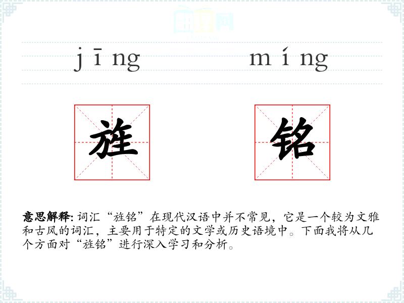 - “铭”:刻在器物上的文字,用以纪念或说明。 结合起来,“旌铭”指的是刻在旌旗上的文字,用以表彰或纪念某人或某事。