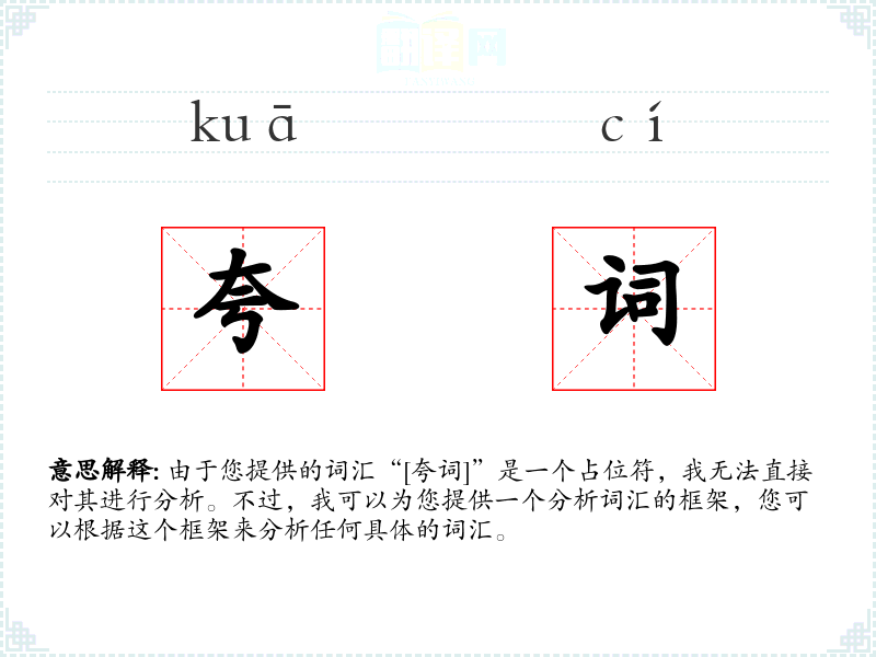 由于您提供的词汇“[夸词]”是一个占位符,我无法直接对其进行分析。不过,我可以为您提供一个分析词汇的框架,您可以根据这个框架来分析任何具体的词汇。