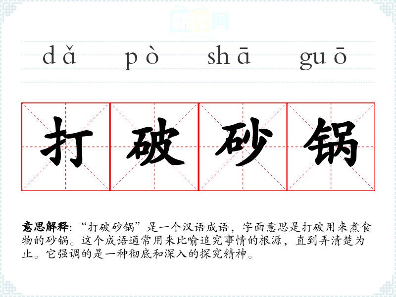 “打破砂锅”是一个汉语成语,字面意思是打破用来煮食物的砂锅。这个成语通常用来比喻追究事情的根源,直到弄清楚为止。它强调的是一种彻底和深入的探究精神。