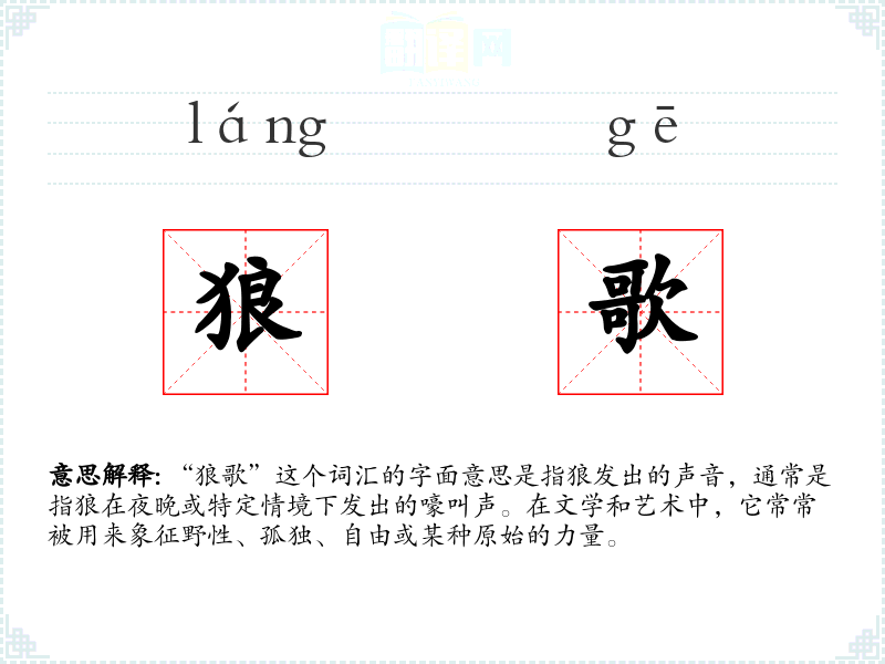“狼歌”这个词汇在中文中直接来源于对狼嚎叫声的描述。在古代文学中,狼常常被赋予神秘和野性的象征意义,因此“狼歌”也逐渐被赋予了更多的象征意义。