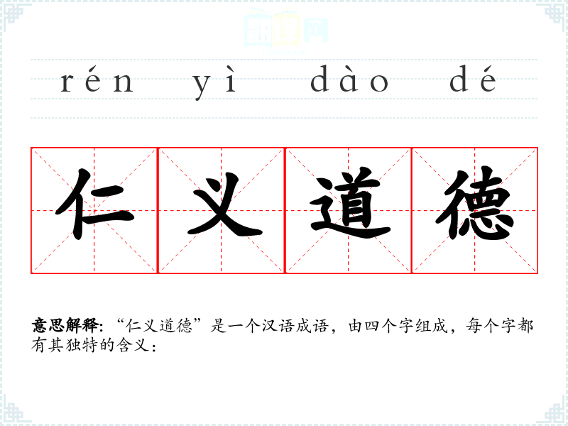 “仁义道德”是一个汉语成语,由四个字组成,每个字都有其独特的含义:
