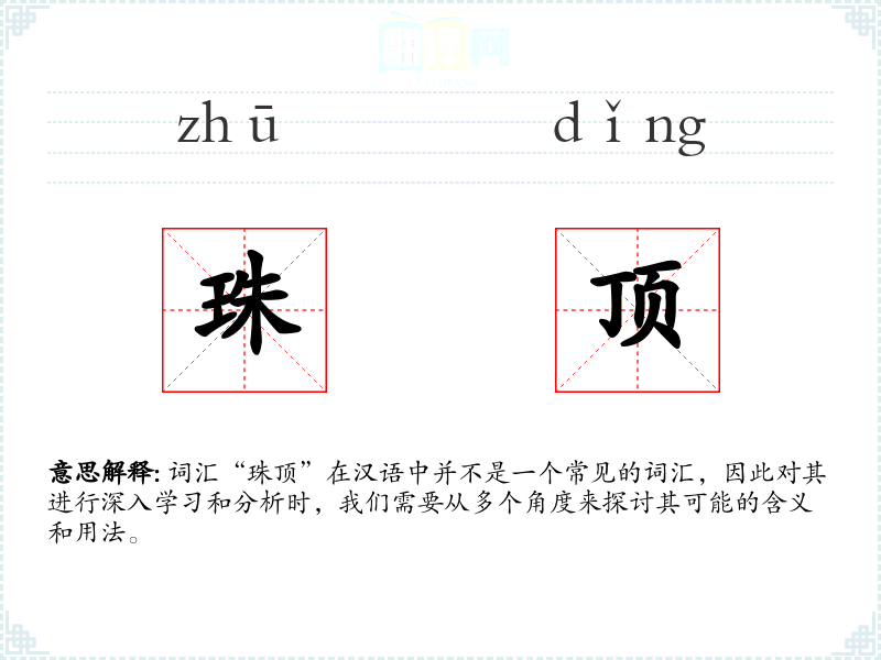 词汇“珠顶”在汉语中并不是一个常见的词汇,因此对其进行深入学习和分析时,我们需要从多个角度来探讨其可能的含义和用法。