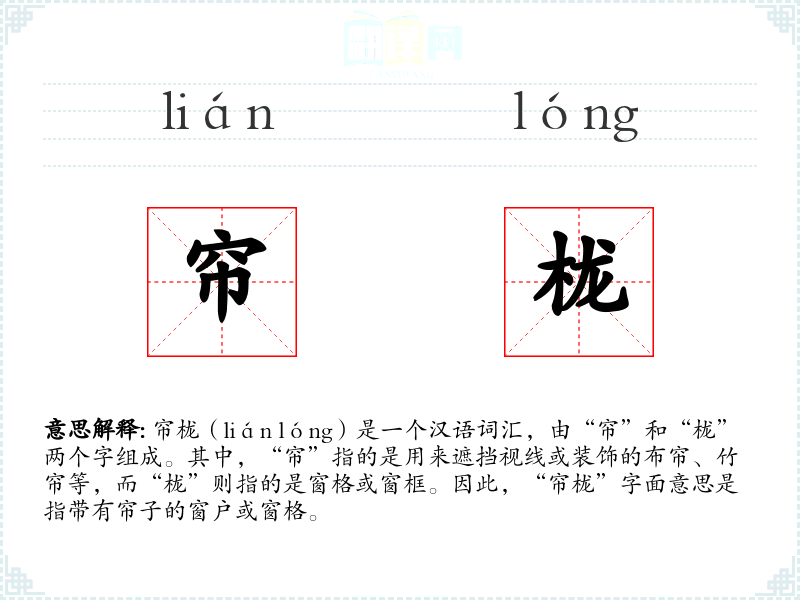 帘栊(lián lóng)是一个汉语词汇,由“帘”和“栊”两个字组成。其中,“帘”指的是用来遮挡视线或装饰的布帘、竹帘等,而“栊”则指的是窗格或窗框。因此,“帘栊”字面意思是指带有帘子的窗户或窗格。