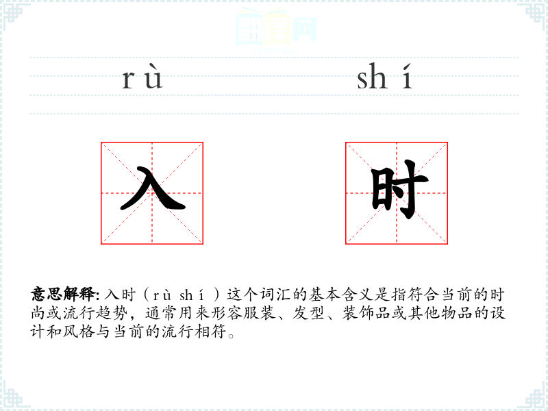 入时(rù shí)这个词汇的基本含义是指符合当前的时尚或流行趋势,通常用来形容服装、发型、装饰品或其他物品的设计和风格与当前的流行相符。