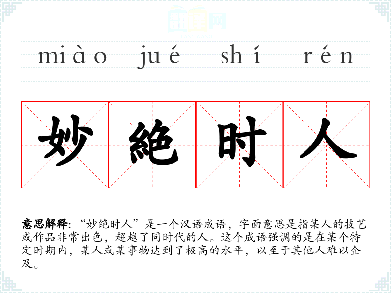 “妙绝时人”是一个汉语成语,字面意思是指某人的技艺或作品非常出色,超越了同时代的人。这个成语强调的是在某个特定时期内,某人或某事物达到了极高的水平,以至于其他人难以企及。