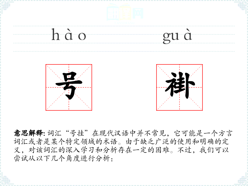 由于“号挂”不是一个标准汉语词汇,我们无法给出一个确切的字面意思和基本含义。它可能是指某种特定的行为、物品或者是某个地方的方言词汇。