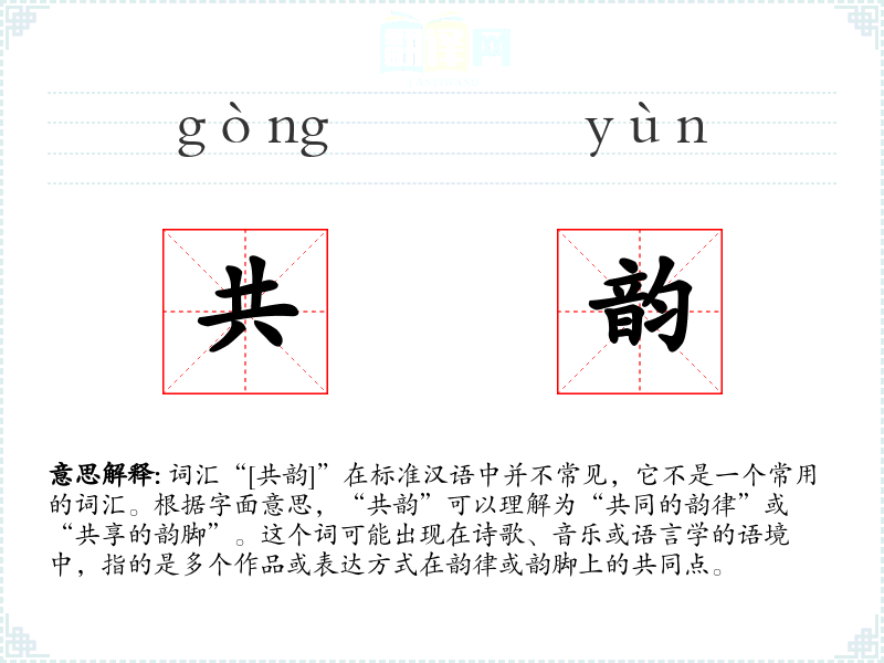 - 专业领域:在语言学或音乐学中,“共韵”可能用于分析和讨论韵律结构和韵脚的使用。