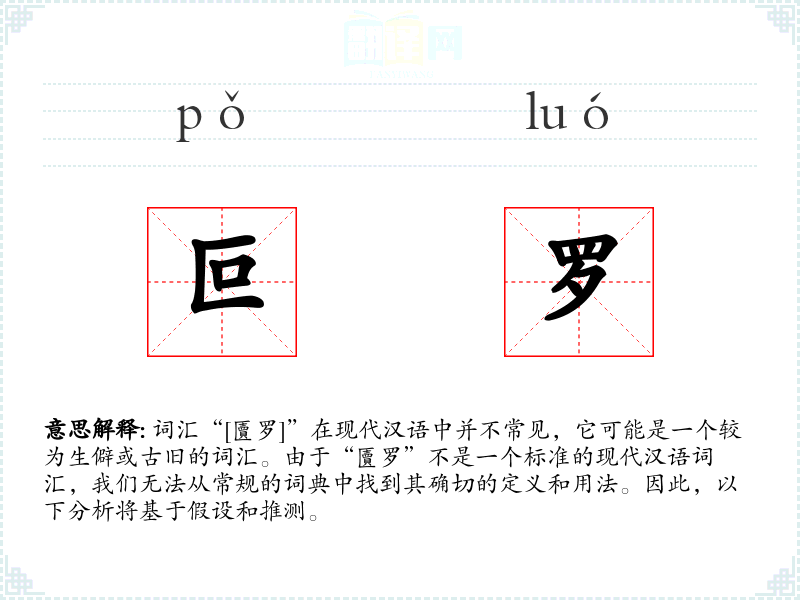 词汇“[匵罗]”在现代汉语中并不常见,它可能是一个较为生僻或古旧的词汇。由于“匵罗”不是一个标准的现代汉语词汇,我们无法从常规的词典中找到其确切的定义和用法。因此,以下分析将基于假设和推测。
