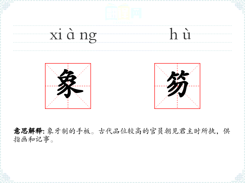 象牙制的手板。古代品位较高的官员朝见君主时所执,供指画和记事。