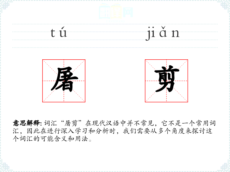 “屠剪”字面意思可能是指用于屠宰的剪刀,或者是与屠宰相关的剪切动作。然而,由于这个词汇并不常见,它的确切含义可能需要结合具体语境来确定。