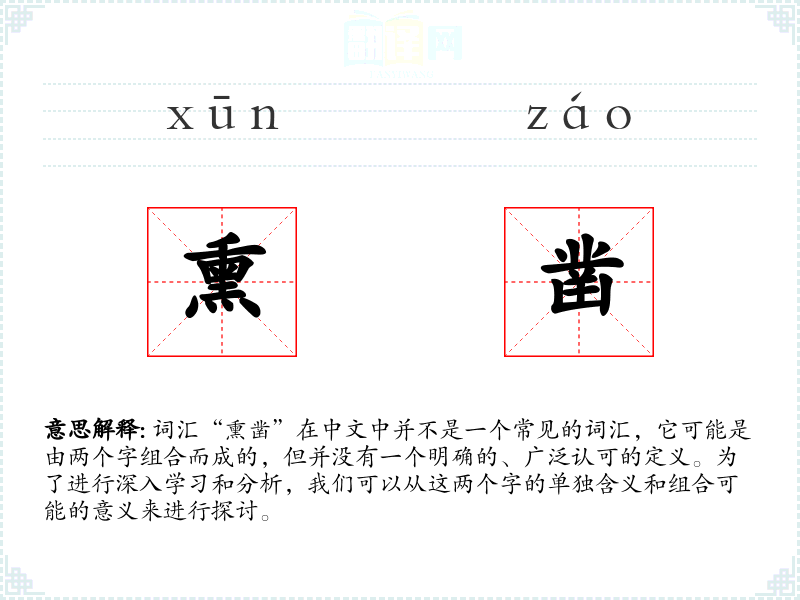 词汇“熏凿”在中文中并不是一个常见的词汇,它可能是由两个字组合而成的,但并没有一个明确的、广泛认可的定义。为了进行深入学习和分析,我们可以从这两个字的单独含义和组合可能的意义来进行探讨。