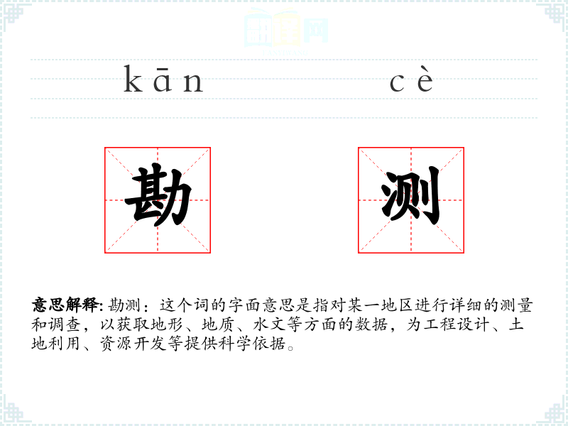 勘测:这个词的字面意思是指对某一地区进行详细的测量和调查,以获取地形、地质、水文等方面的数据,为工程设计、土地利用、资源开发等提供科学依据。