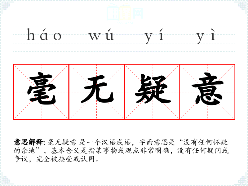 毫无疑意 是一个汉语成语,字面意思是“没有任何怀疑的余地”,基本含义是指某事物或观点非常明确,没有任何疑问或争议,完全被接受或认同。