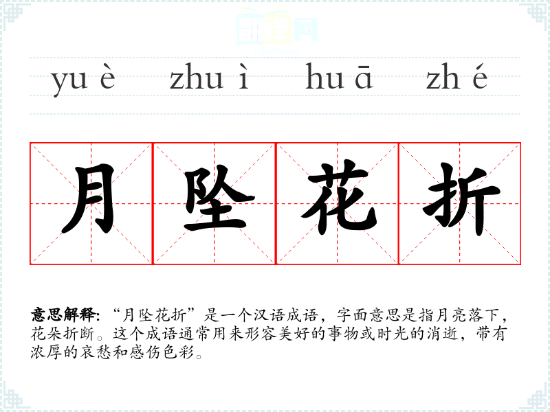 “月坠花折”是一个汉语成语,字面意思是指月亮落下,花朵折断。这个成语通常用来形容美好的事物或时光的消逝,带有浓厚的哀愁和感伤色彩。