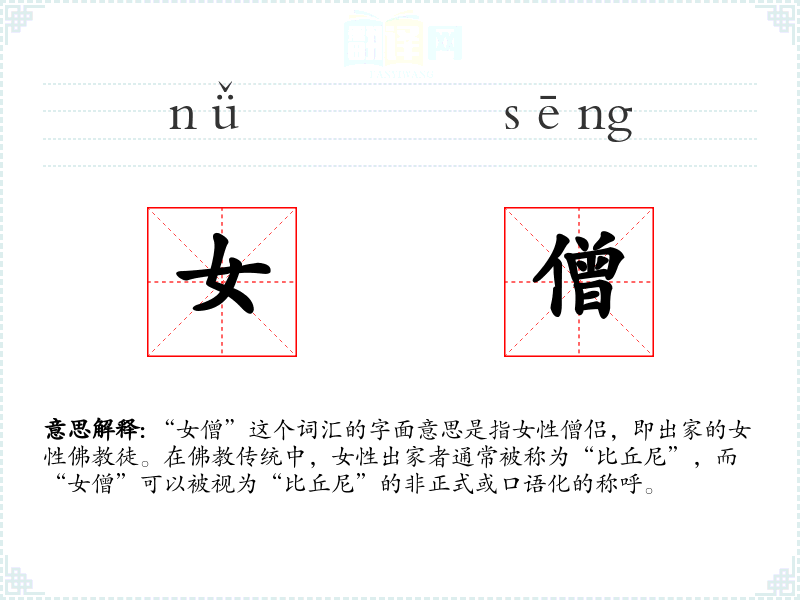 - 同义词:比丘尼、尼姑