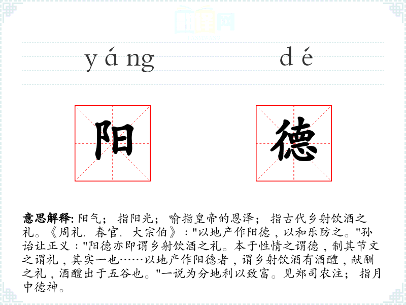 1.阳气; 指阳光; 喻指皇帝的恩泽; 指古代乡射饮酒之礼。《周礼.春官.大宗伯》﹕"以地产作阳德﹐以和乐防之。"孙诒让正义﹕"阳德亦即谓乡射饮酒之礼。本于性情之谓德﹐制其节文之谓礼﹐其实一也……以地产作阳德者﹐谓乡射饮酒有酒醴﹐献酬之礼﹐酒醴出于五谷也。"一说为分地利以致富。见郑司农注; 指月中德神。