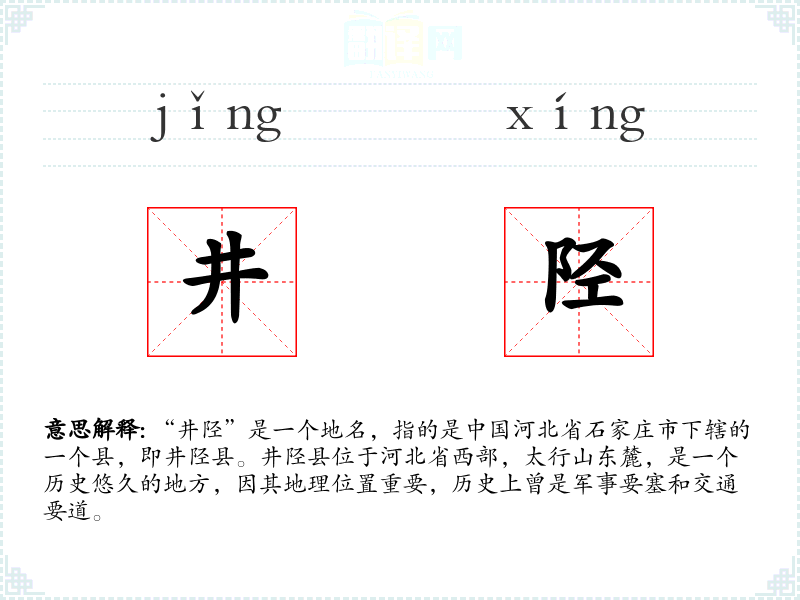 “井陉”是一个地名,指的是**河北省石家庄市下辖的一个县,即井陉县。井陉县位于河北省西部,太行山东麓,是一个历史悠久的地方,因其地理位置重要,历史上曾是军事要塞和交通要道。