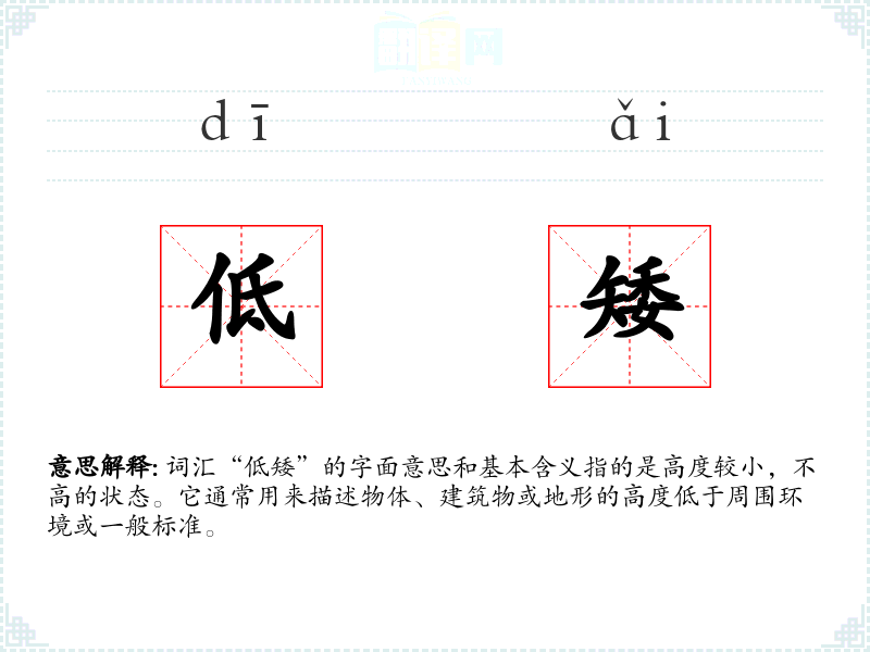 “低矮”一词由“低”和“矮”两个字组成,都是描述高度不高的意思。在古代汉语中,“低”和“矮”都有单独使用的记录,后来组合成“低矮”以强调高度小的状态。