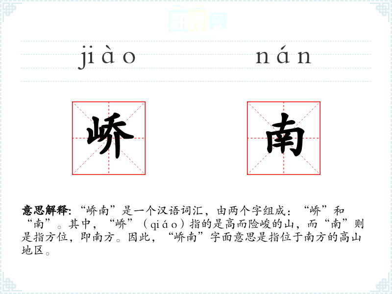 “峤南”是一个汉语词汇,由两个字组成:“峤”和“南”。其中,“峤”(qiáo)指的是高而险峻的山,而“南”则是指方位,即南方。因此,“峤南”字面意思是指位于南方的高山地区。