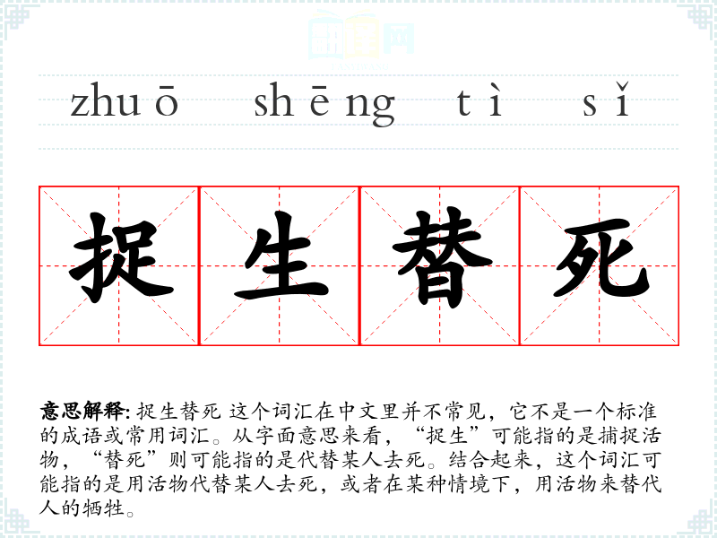 捉生替死 这个词汇在中文里并不常见,它不是一个标准的成语或常用词汇。从字面意思来看,“捉生”可能指的是捕捉活物,“替死”则可能指的是代替某人去死。结合起来,这个词汇可能指的是用活物代替某人去死,或者在某种情境下,用活物来替代人的牺牲。