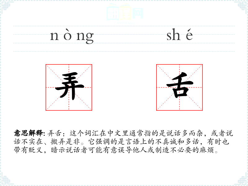弄舌:这个词汇在中文里通常指的是说话多而杂,或者说话不实在、搬弄是非。它强调的是言语上的不真诚和多话,有时也带有贬义,暗示说话者可能有意误导他人或制造不必要的麻烦。