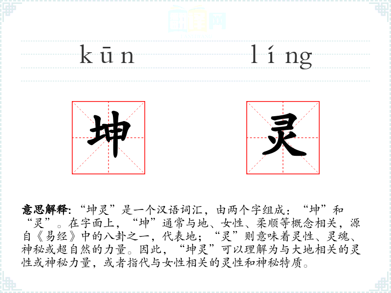 “坤”源自《易经》,最初用于描述地的属性,后来扩展到与女性相关的特质。“灵”则源自古代对超自然力量的信仰,逐渐演变为指代灵性或灵魂。