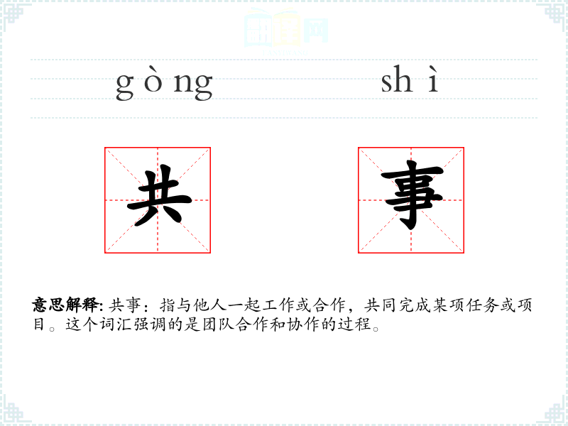 共事:指与他人一起工作或合作,共同完成某项任务或项目。这个词汇强调的是团队合作和协作的过程。