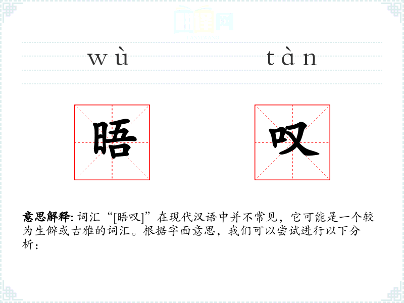 词汇“[晤叹]”在现代汉语中并不常见,它可能是一个较为生僻或古雅的词汇。根据字面意思,我们可以尝试进行以下分析: