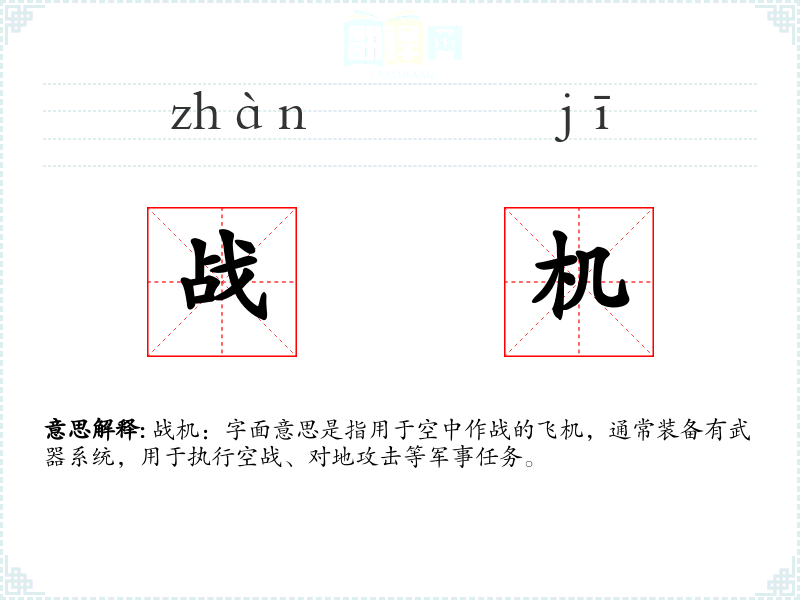 战机:字面意思是指用于空中作战的飞机,通常装备有武器系统,用于执行空战、对地攻击等军事任务。