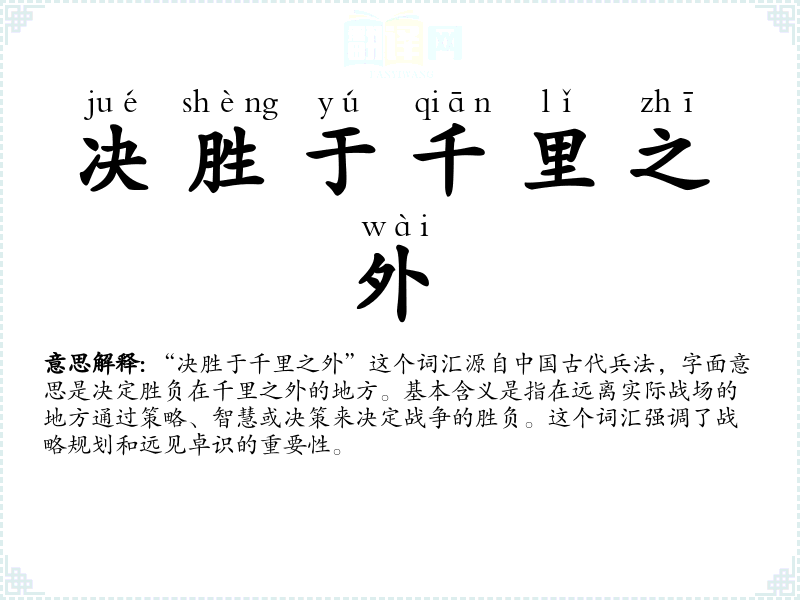 “决胜于千里之外”这个词汇源自中国古代兵法,字面意思是决定胜负在千里之外的地方。基本含义是指在远离实际战场的地方通过策略、智慧或决策来决定战争的胜负。这个词汇强调了战略规划和远见卓识的重要性。
