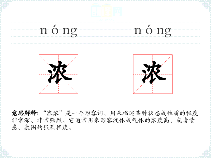 “浓浓”是一个形容词,用来描述某种状态或性质的程度非常深、非常强烈。它通常用来形容液体或气体的浓度高,或者情感、氛围的强烈程度。