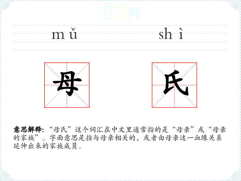 “母氏”这个词汇在中文里通常指的是“母亲”或“母亲的家族”。字面意思是指与母亲相关的,或者由母亲这一血缘关系延伸出来的家族成员。