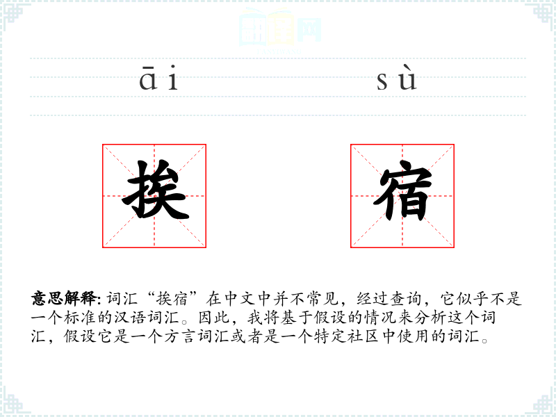 词汇“挨宿”在中文中并不常见,经过查询,它似乎不是一个标准的汉语词汇。因此,我将基于假设的情况来分析这个词汇,假设它是一个方言词汇或者是一个特定社区中使用的词汇。