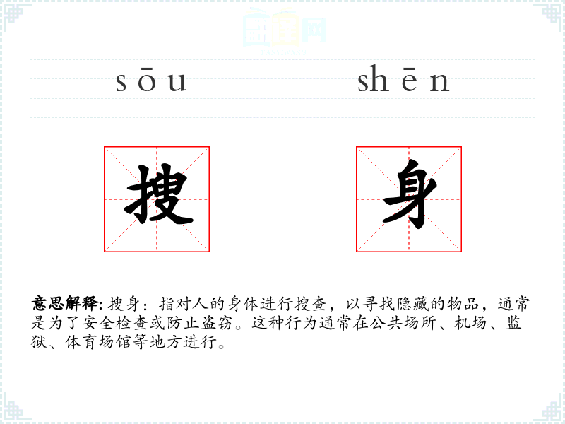 搜身:指对人的身体进行搜查,以寻找隐藏的物品,通常是为了安全检查或防止盗窃。这种行为通常在公共场所、机场、监狱、体育场馆等地方进行。