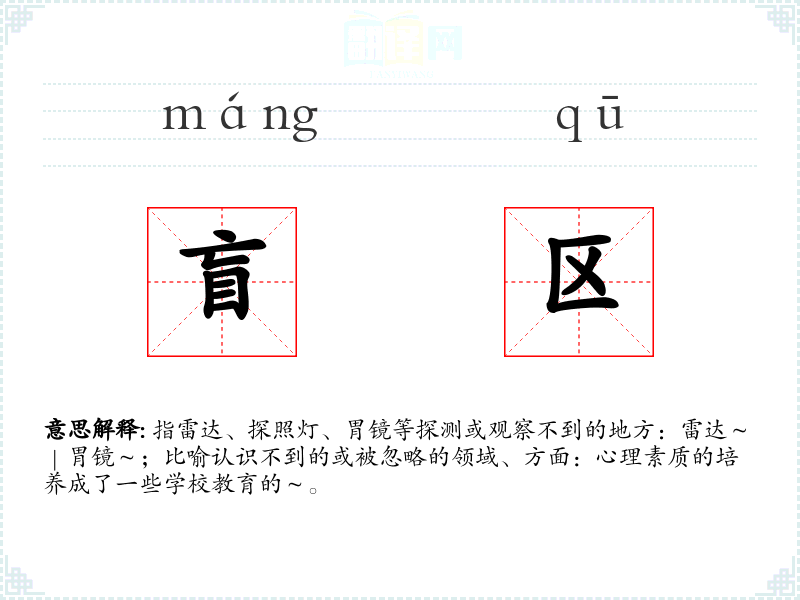 指雷达、探照灯、胃镜等探测或观察不到的地方:雷达~|胃镜~;比喻认识不到的或被忽略的领域、方面:心理素质的培养成了一些学校教育的~。