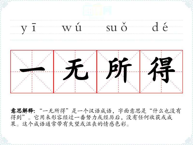 “一无所得”是一个汉语成语,字面意思是“什么也没有得到”。它用来形容经过一番努力或经历后,没有任何收获或成果。这个成语通常带有失望或沮丧的情感色彩。