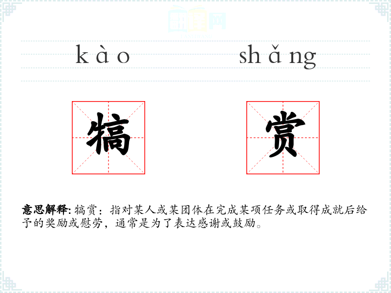 犒赏:指对某人或某团体在完成某项任务或取得成就后给予的奖励或慰劳,通常是为了表达感谢或鼓励。