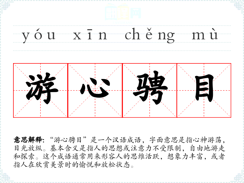 同义词中,“心旷神怡”强调心情的舒畅和精神的愉悦,“神游物外”强调思维的超脱和自由,“思绪万千”强调思维的丰富和多变。反义词则强调专注和集中,与“游心骋目”的自由和放纵形成对比。