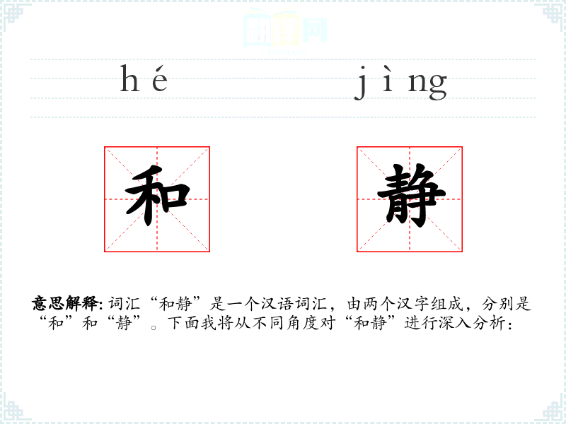 - 在英语中,“和静”可以对应为“serene”或“tranquil”,都表达了类似的和谐平静之意。