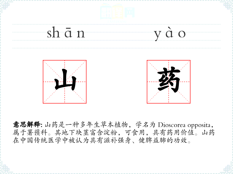 - 同义词:薯蓣、淮山(特指产自淮河流域的山药)