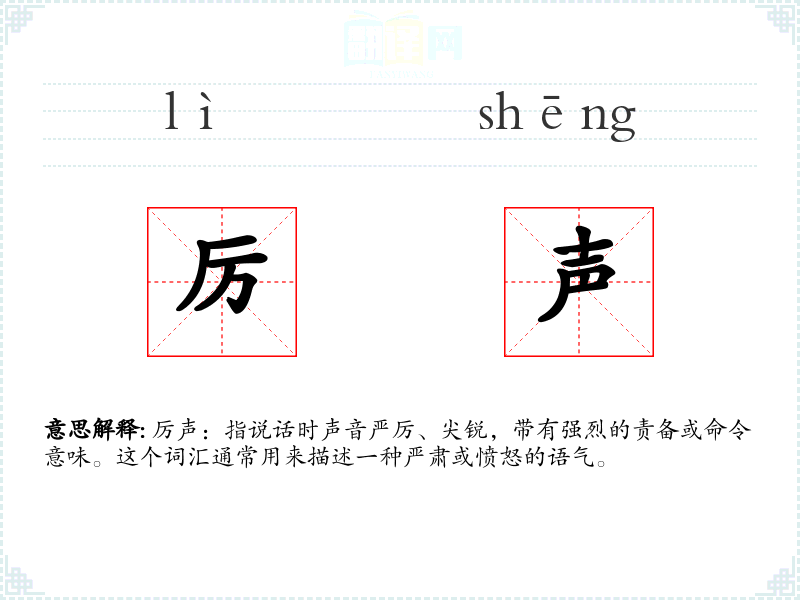 厉声:指说话时声音严厉、尖锐,带有强烈的责备或命令意味。这个词汇通常用来描述一种严肃或愤怒的语气。