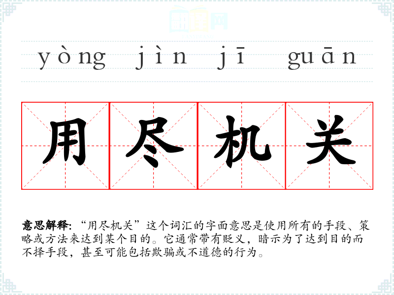 “用尽机关”这个词汇的字面意思是使用所有的手段、策略或方法来达到某个目的。它通常带有贬义,暗示为了达到目的而不择手段,甚至可能包括欺骗或不道德的行为。