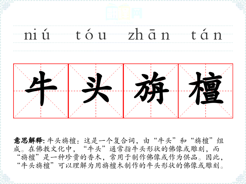 牛头旃檀:这是一个复合词,由“牛头”和“旃檀”组成。在**文化中,“牛头”通常指牛头形状的佛像或雕刻,而“旃檀”是一种珍贵的香木,常用于制作佛像或作为供品。因此,“牛头旃檀”可以理解为用旃檀木制作的牛头形状的佛像或雕刻。