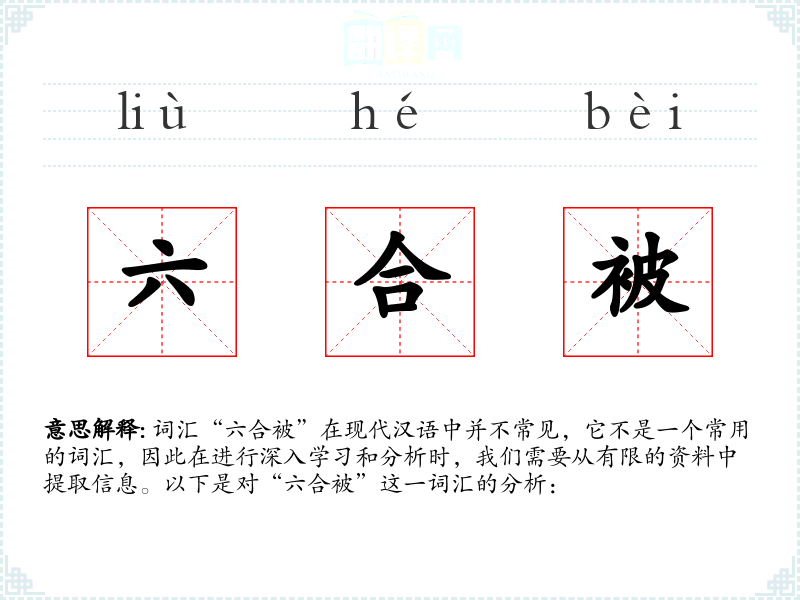 由于“六合被”不是一个常用词汇,它可能给人一种神秘或古朴的感觉,可能会让人联想到古代的文化和生活方式。