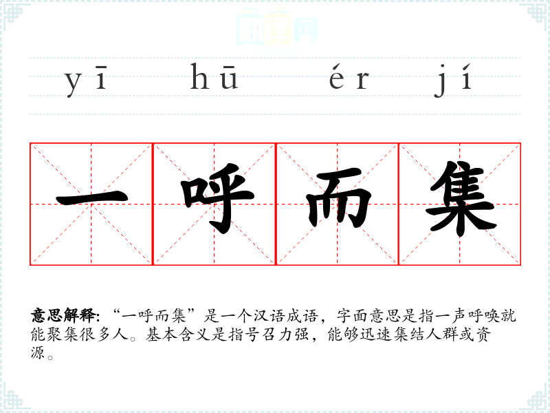 “一呼而集”是一个汉语成语,字面意思是指一声呼唤就能聚集很多人。基本含义是指号召力强,能够迅速集结人群或资源。