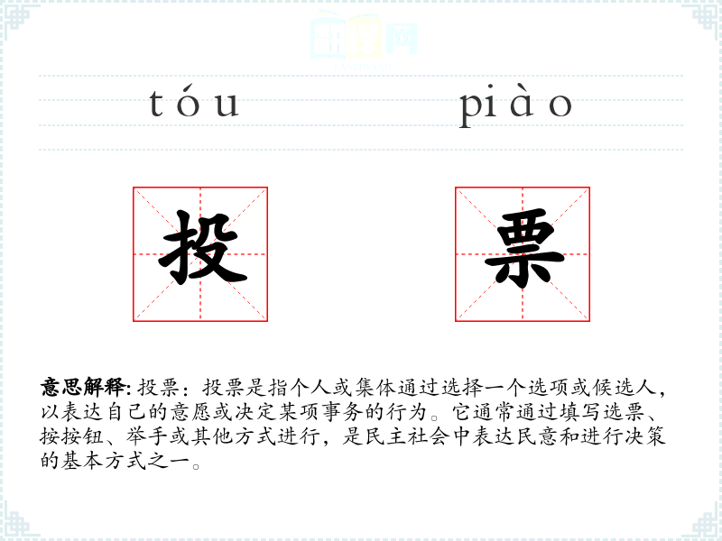 投票:投票是指个人或集体通过选择一个选项或候选人,以表达自己的意愿或决定某项事务的行为。它通常通过填写选票、按按钮、举手或其他方式进行,是民主社会中表达民意和进行决策的基本方式之一。