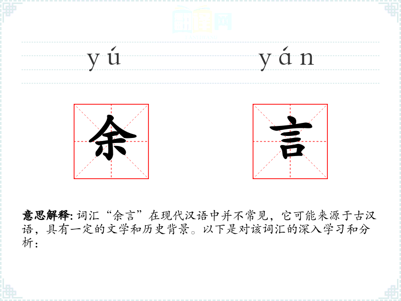 词汇“余言”在现代汉语中并不常见,它可能来源于古汉语,具有一定的文学和历史背景。以下是对该词汇的深入学*和分析: