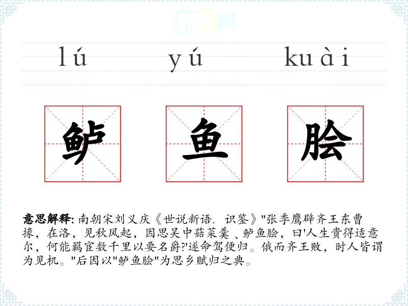 1.南朝宋刘义庆《世说新语.识鉴》"张季鹰辟齐王东曹掾,在洛,见秋风起,因思吴中菇菜羹﹑鲈鱼脍,曰'人生贵得适意尔,何能羁宦数千里以要名爵?'遂命驾便归。俄而齐王败,时人皆谓为见机。"后因以"鲈鱼脍"为思乡赋归之典。