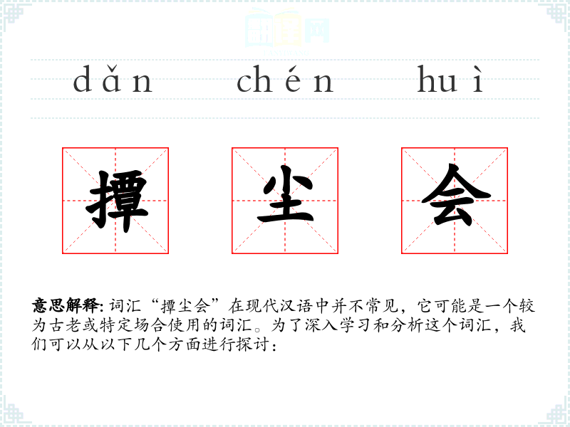 词汇“撢尘会”在现代汉语中并不常见,它可能是一个较为古老或特定场合使用的词汇。为了深入学*和分析这个词汇,我们可以从以下几个方面进行探讨: