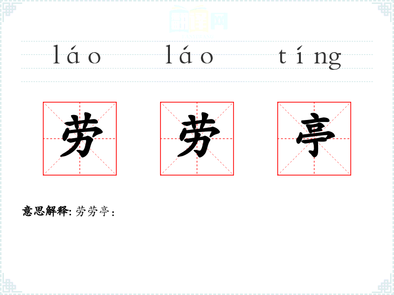 - 字面意思:劳劳亭是一个汉语词汇,由“劳劳”和“亭”两个词组成。其中,“劳劳”通常指辛苦、劳累的状态,而“亭”是指一种小型的建筑物,通常用于休息或观赏风景。